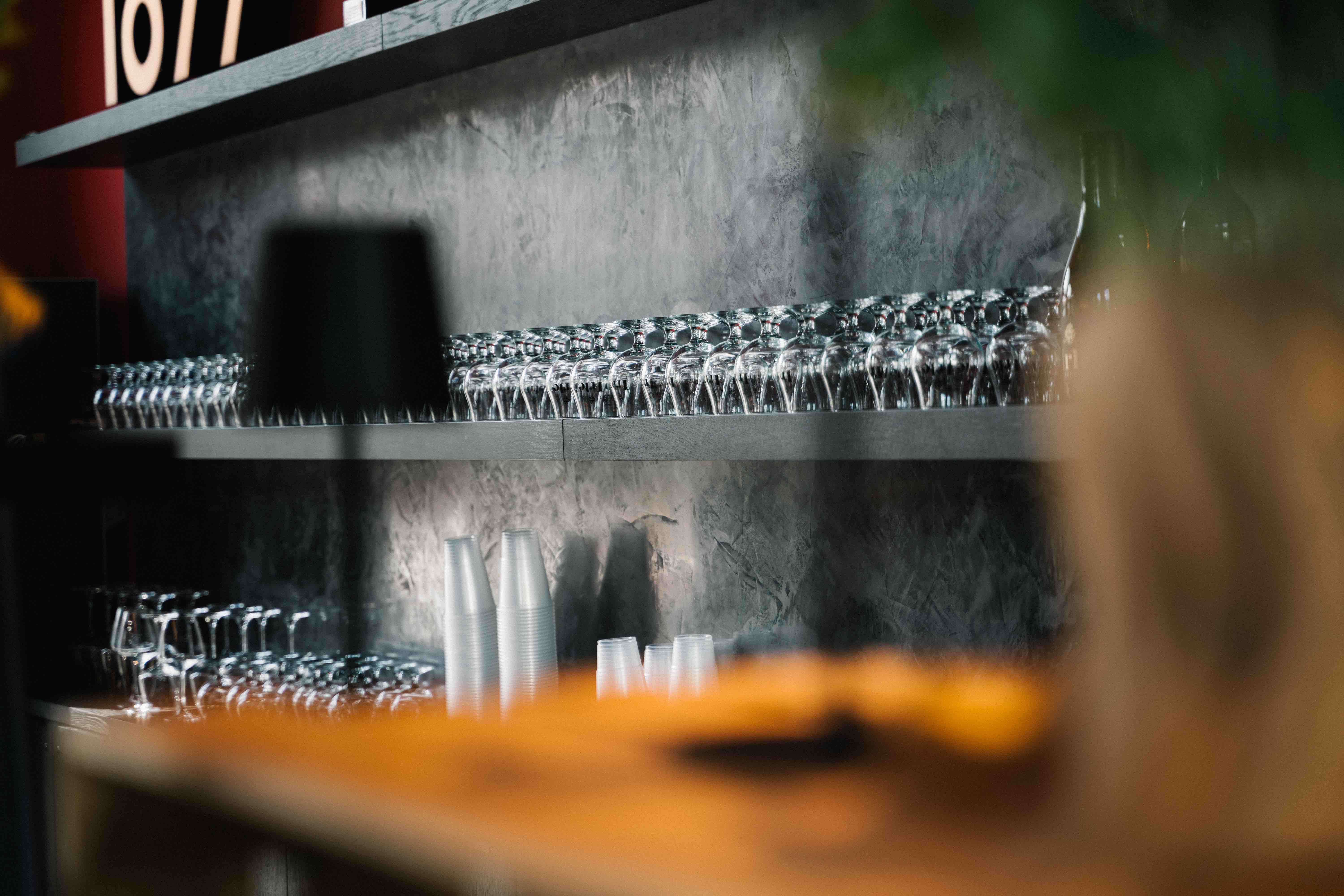 Das Herzstück ist die Bar: ein Treffpunkt, an dem Gespräche entstehen. Dahinter sorgt ein beleuchtetes Rückbuffet mit Regalsystem für Struktur und Atmosphäre. Spezialangefertigte Thekenmöbel, ein separater Buffetbereich und zwei mobile Kaffeebars schaffen den nötigen Service-Komfort für größere Events.